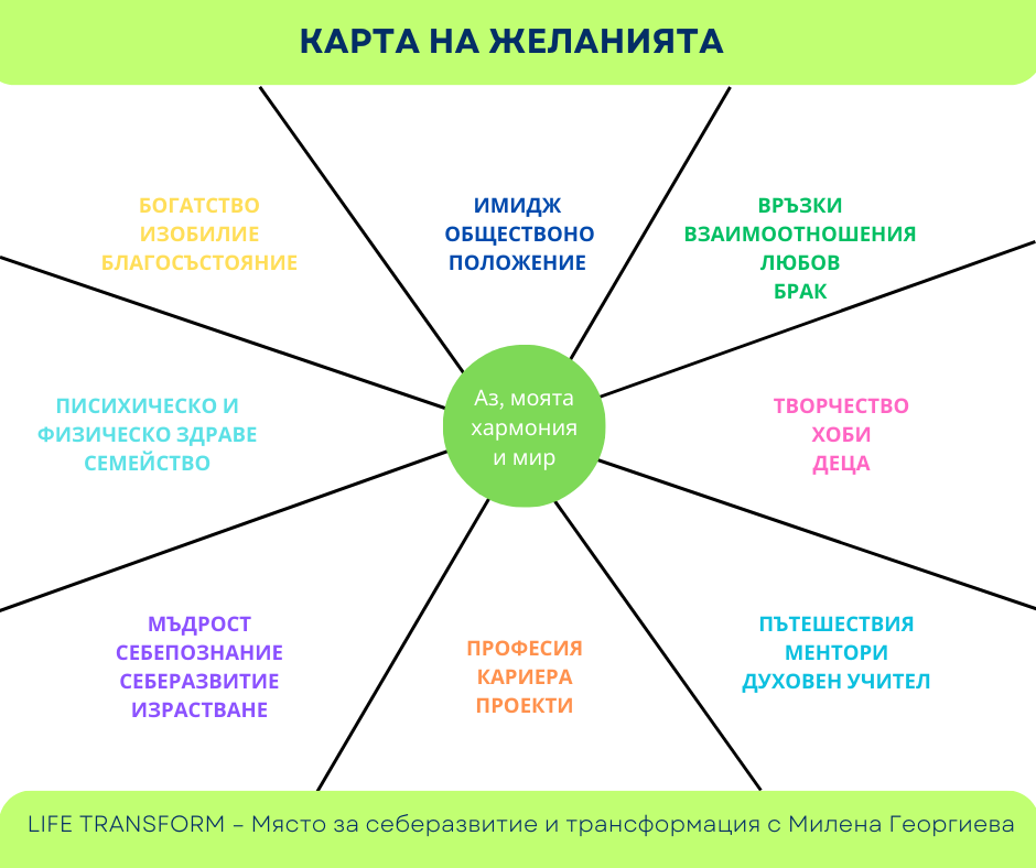 Смисълът от изработването на картата на желанията е умът ви да се фокусира върху това, което искате, а не върху това, от което бягате и не искате. Това се нарича мотивация „КЪМ“ и е мощен активатор да осъществите мечтите си. Мотивация „ОТ“ имаме, когато искаме да избягаме от нещо, което не искаме.