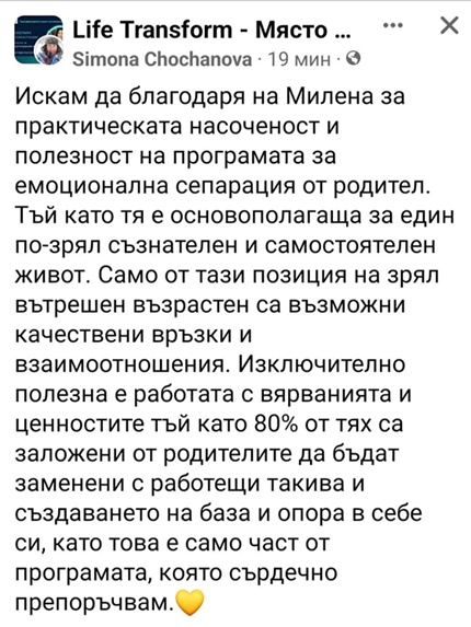 Практиките в Програмата в тяхната цялост ви помагат да излезете от самосаботажния вътрешен диалог, за да се разбие порочният цикъл от самосмачкващи и обезкуражаващи думи и токсични емоции, насочени към себе си. Помагат ви да се отделите емоционално от родителя или от друг човек. Работим за това да направите несъзнателни модели на поведение съзнателни, за да не ръководят живота ви.