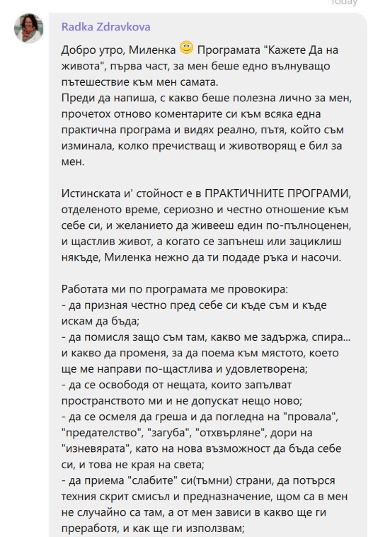 Всичко, което е останало неотработено и неизлекувано в миналото, наше или на предците ни, се проявява като конфликти във връзките ни. Програмата „Кажете ДА на живота, любовта и благополучието“ е чудесна възможност тези модели да бъдат осветлени, забелязани и отработени. Нездравите динамики в различните ни взаимоотношения могат да еволюират. Само така можем да се преместим към нещо различно и по-добро.